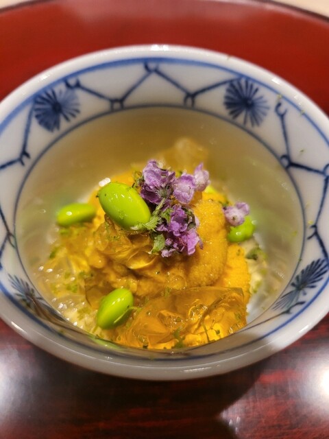 カリフラワーの摺り流しに雲丹やトマトジュレ、穂紫蘇