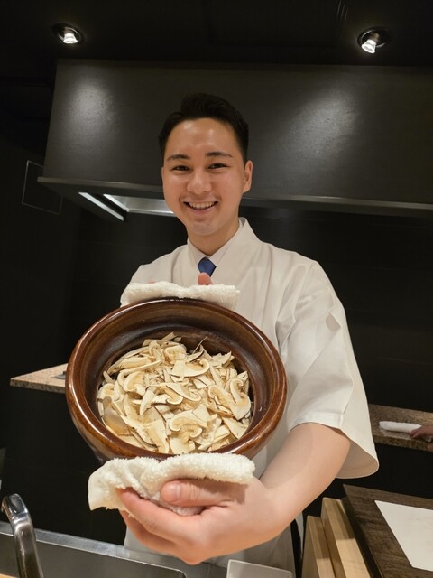 滋賀県の近江米(コシヒカリ)にスライスした生の松茸を。