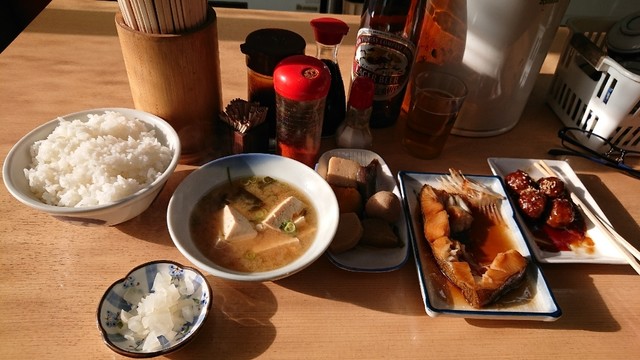またまた負けて貰うて、おかず5種 大瓶ビール 大飯 みそ汁 1550円やた