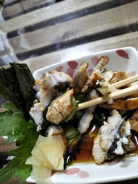 うざく(んなぎ三杯酢)400円 エビ150円(尻尾がツインテール)まぐろ150円 炙りんなぎ400円
