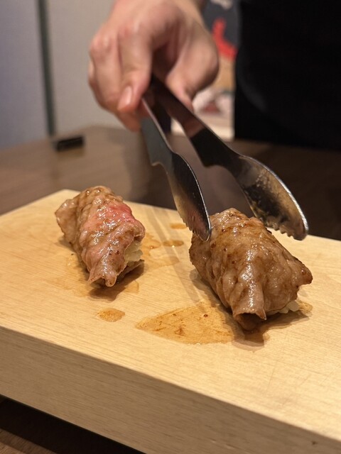 和牛のにぎりは玄米茶でシャリが炊かれ、仄かに感じる香ばしさと和牛の一体感…