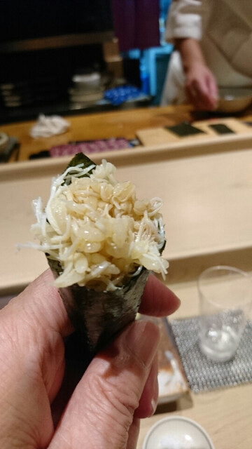 目の前で丁寧にさばいた蟹の身を巻物にして、素手でいただきます。