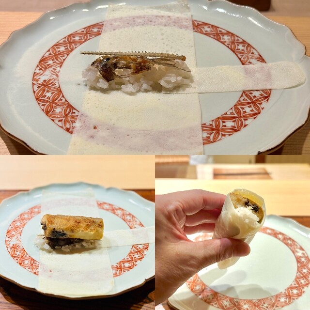 竹内養鶏場の米艶と言う白い黄身の卵で絹の衣が布団の様に引かれていてその上に岩魚の揚げた身と骨をクレープや手巻き寿司の様に包み込んで頂く明寂さんのスペリャリテ