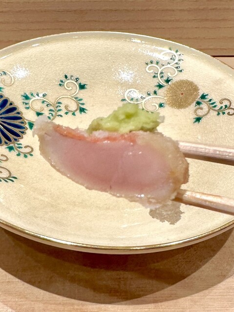 迷い金目鯛はこの時期のみしかとれないものでこれも絶妙に揚げの火入れがなされており桜色の身がしっとりとしていて旨みを染み出させてきます