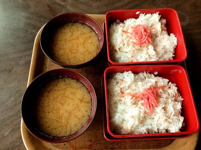 以前ネットで見ていた、かに飯には、竹の子と椎茸の煮たのが乗っていたんだけれど今は乗っていませんでした。