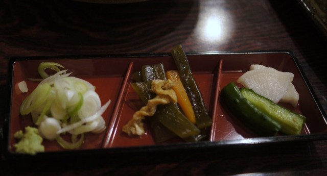 薬味はねぎ、わさび以外に、漬物類も付きました。