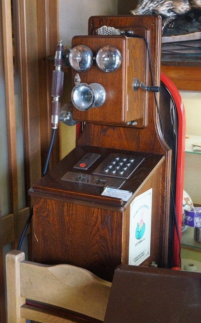 玄関には古い電話機が置いてあります。10円とか100円とか入れる場所があるので公衆電話のようです。