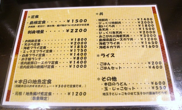 メニューを見ると一番上に”島根定食”があります。刺身、煮付け、焼き物、揚げ物が付いているようです。