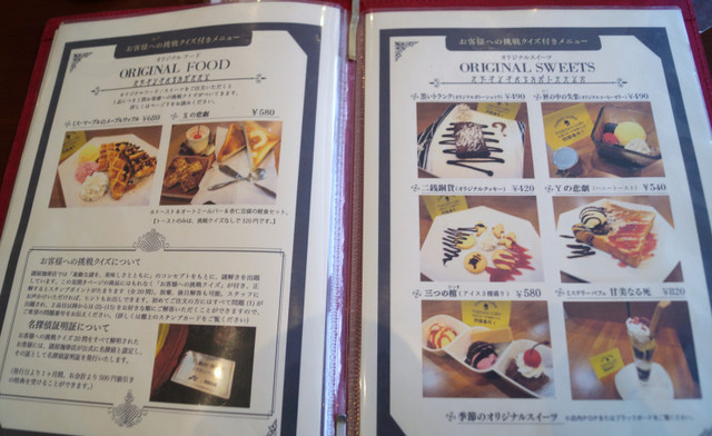 ミス・マーブルのメーブルワッフル、Xの悲劇、黒いトランク、匣の中の失楽、二銭銅貨、Yの悲劇等など興味津々のメニューが数多くあります。