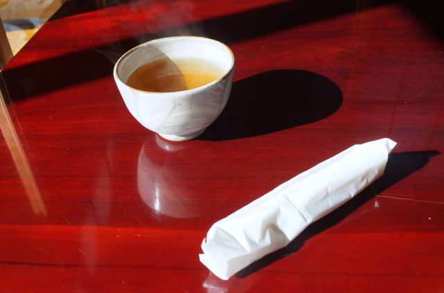 お茶は茶碗なみの大きさの湯のみに入っています。開店前なので少々時間がかかりますと言われました。