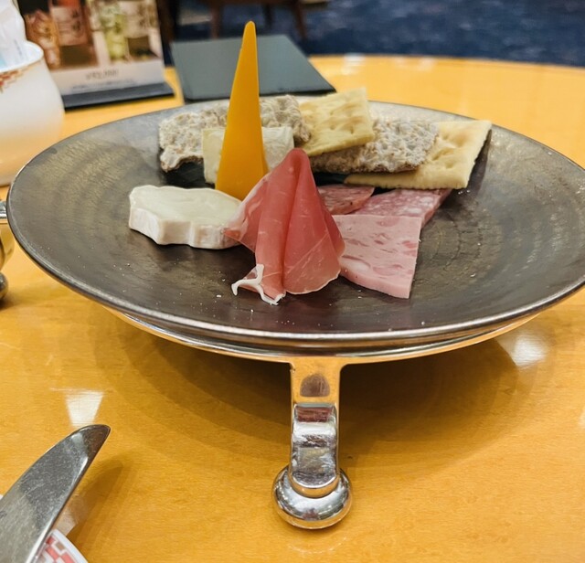 一番下がチーズとハムの盛り合わせ。もうスパークリングワイン頂くしかないじゃないですか。
