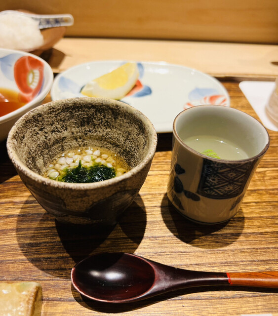 ◎天つゆと大根おろし、西伊豆産の塩と静岡産のレモンが置かれている。