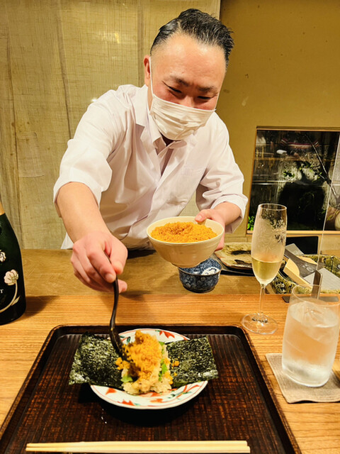 る。焼いた真鱈の白子を野口大将が酢飯に乗せてくれる。レアの真鱈の白子と酢飯の相性も最高。