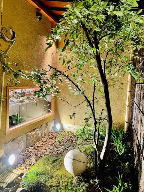 店内は欅のカウンター席が9席とテーブル席の個室があり、カウンター席からは坪庭も眺められ、室内は京都らしい風情を醸し出す。