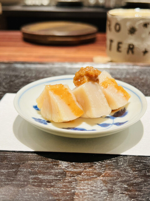 ◆煮帆立(青森)と赤うに(愛媛)コチジャンソース ◎赤うにの濃厚な甘味とコチジャンのハーモニーが格別な味わいに仕立てている。