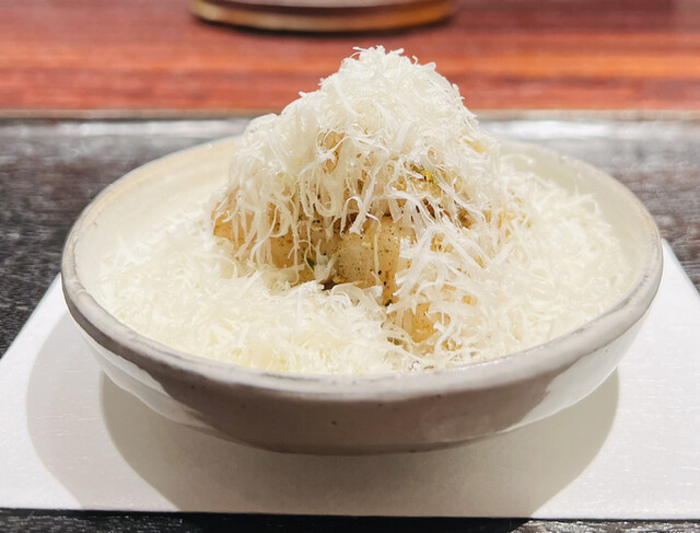 ◆ペッパー生麩の素揚げと賀茂茄子と芥子酢味噌のペースト ブラータチーズ(伊・プーリア州) ◎生麩は、京都御所にも献上してきた京都を代表する麩屋である麩嘉の生麩。