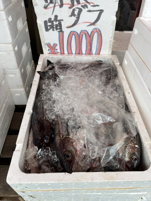 黒カレイ500円の発泡スチロールあり、中身見て2箱購入。1箱に特大の黒カレイ6〜7匹。お店の人に聞くとおよそ1箱4kg。めちゃくちゃ安いですね!