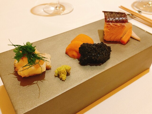 最初の方に出て来たキャビアと旬のお魚、キャビアこんなに食べていいの?という感じの盛り盛り。