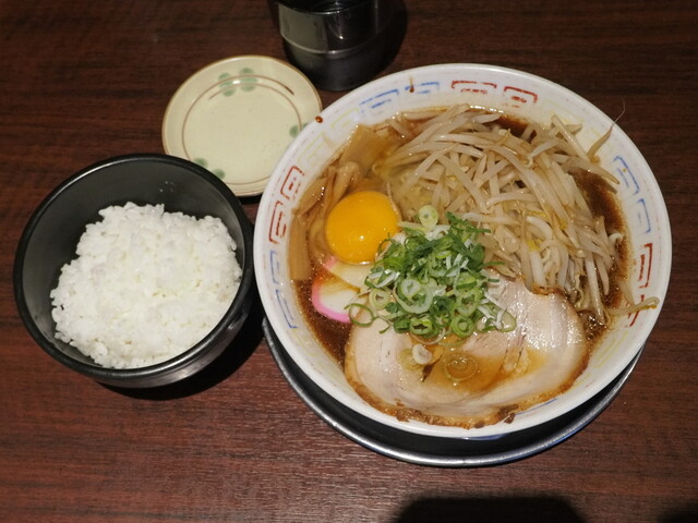 茶色いスープに麺は見えず、チャーシュー1枚、かまぼこ2切れ、メンマ、それに生卵、もやしがのって、九条ねぎ的なネギ小口切りが少々のっています。