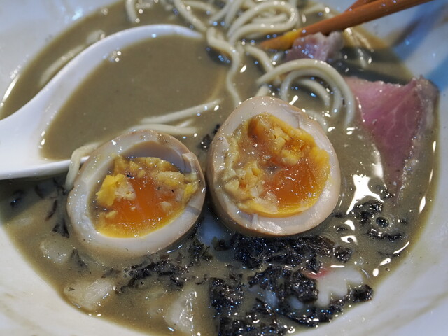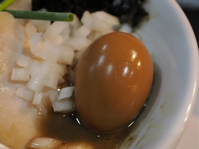 ・味玉は、ここもやはり、黄身が固まり気味ですが、まだねっとりとしています。いい色の染まっていますが、見かけの通り味は染みています。スープよりはすっきりとした味。