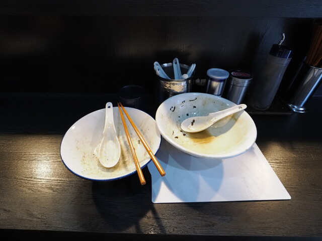 しばらくすると、表面にごく薄い膜が張りました。あれ、動物系の出汁を使っているのでしょうか。あとで調べると、マイレビさんのレビューに鶏白湯を使っているとありました。なるほどという感じです。でも鶏の感じはごくごく控え目でしょう。