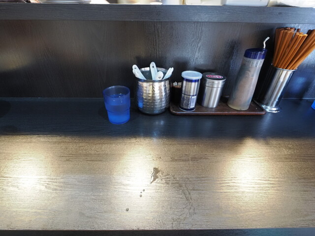 卓上にはレンゲと箸と、GABANのコショー(使いませんでしたが、たぶん黒)、とうがらし(一味でしょう)、それから酢がありました。この酢は、昆布とお茶パックみたいな袋に入った粉(たぶん煮干し粉)がありました。