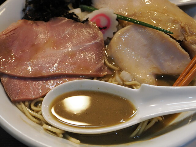 黒っぽい濃い茶色のスープにストレート中細麵、トッピングは、分厚い鳥チャーシュー2枚、豚チャーシュー3枚、いい色に染まった味玉1個、ばら海苔、そして刻みタマネギ。そして、十字に組まれたアサツキの先っぽのようなもの。その真ん中をなるとが押さえています。特製は300円増し以上の豪華さですね。