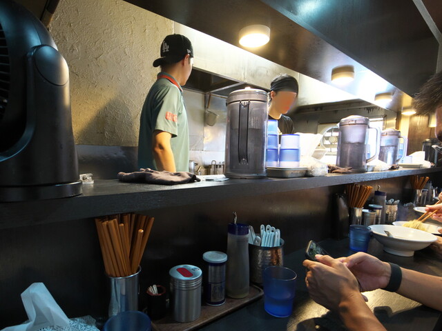 店内、薄暗く、カウンターも黒で、独特の雰囲気です。エアコンの効きが悪く、入り口が開けっぱなしなので、結構暑いです。