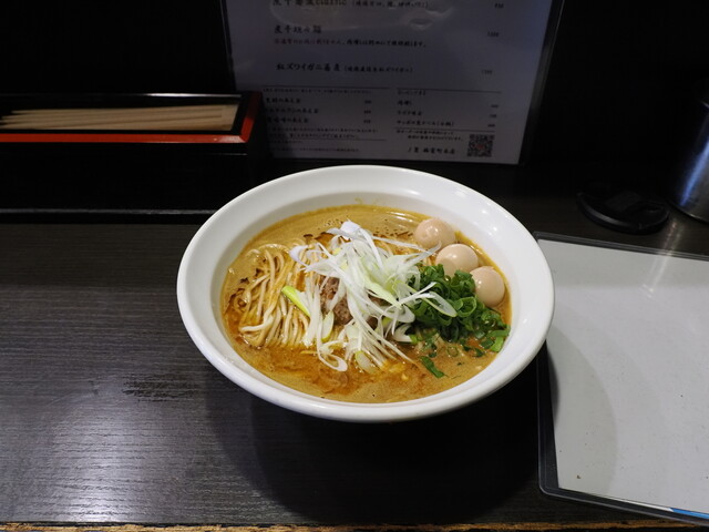 まずは、煮干担々麵をお願いします。ウズラ味玉(100円)も付けます。
