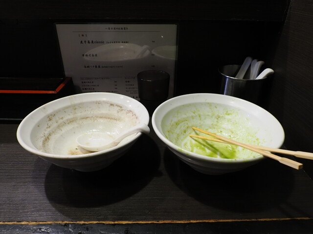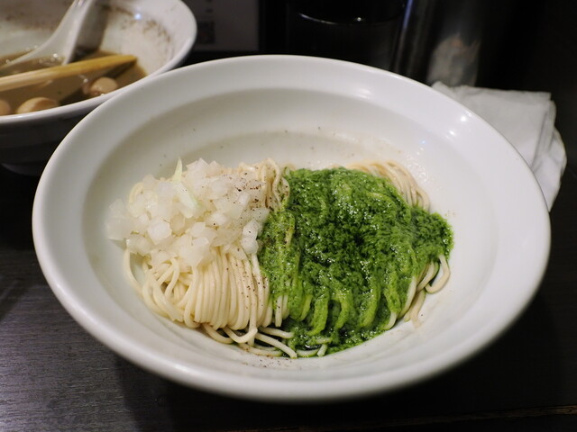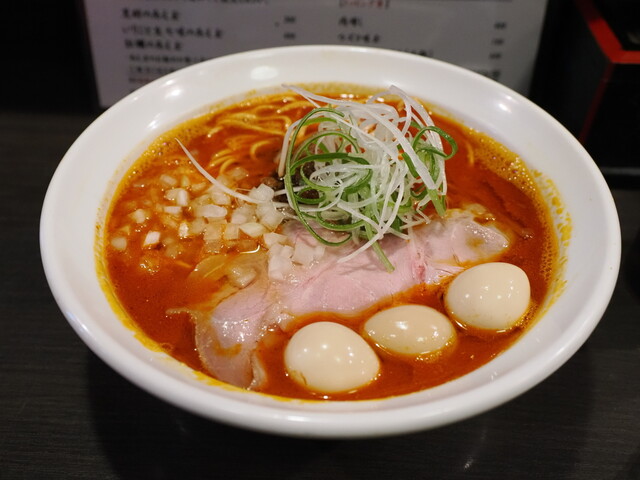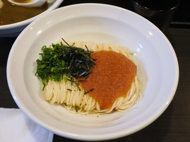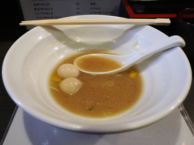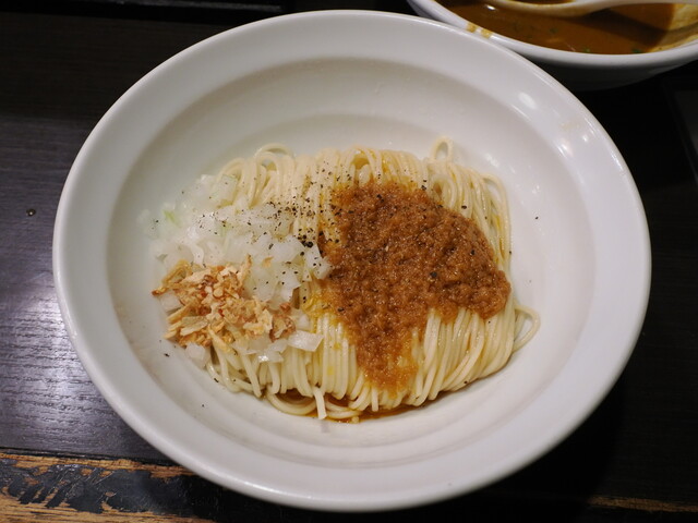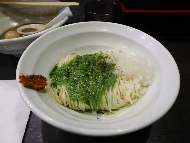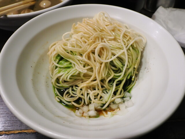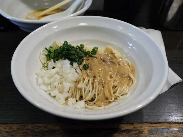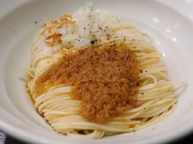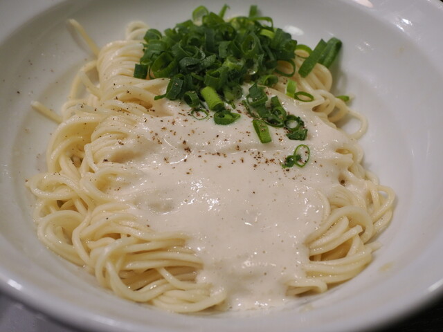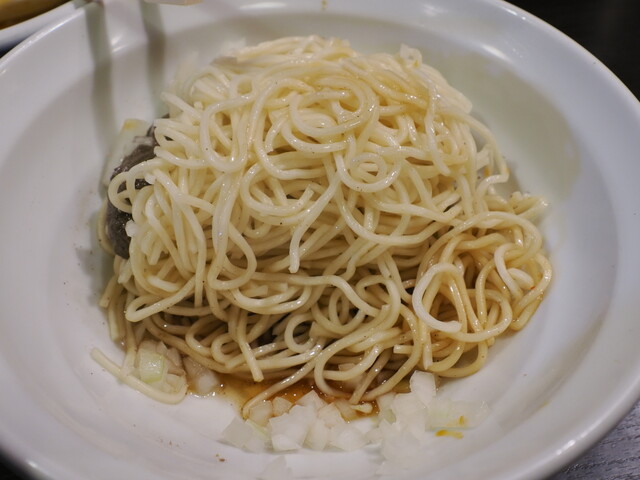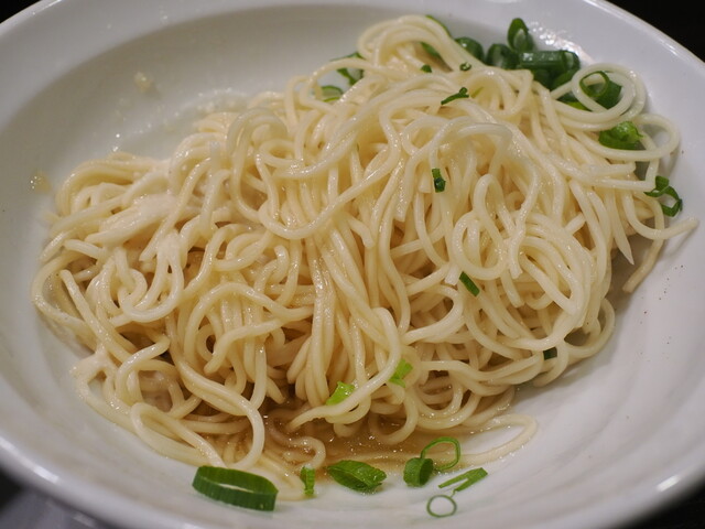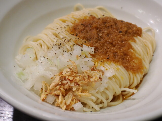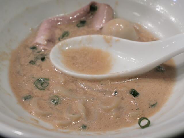 ちょっと茶色みのあるクリーム状のスープにストレート細麺。のっているのは、アーリーレッドかなんかの赤タマネギを刻んだもの、青ねぎ小口切りと、唐辛子(乾燥)輪切り少々。茶色いのはフライドガーリックでしょうか。油が浮いてますが、これがオリーブオイルか。