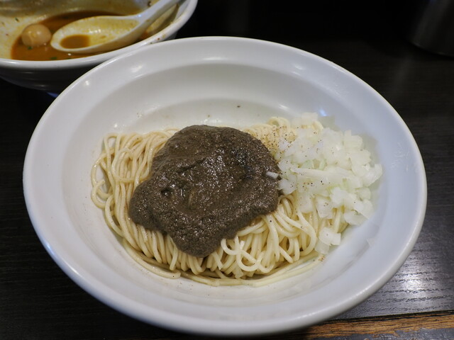 つけ汁は茶色でやはり、トマトの赤みがあります。