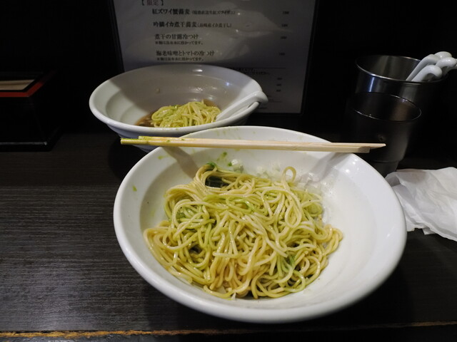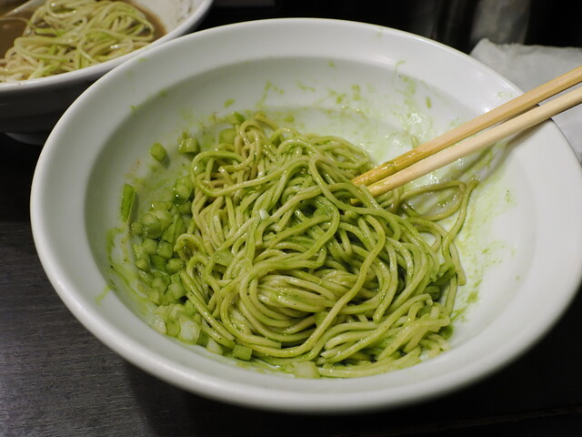 つけ汁は緑がかった黄土色でちょっと赤い部分があります。