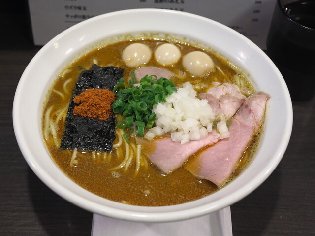 赤っぽい明るい茶色のスープにストレート細麺。低温調理肉2枚、刻みタマネギ、青ねぎ小口切りです(それとうずら)。真ん中に、おかず海苔サイズの海苔に赤い粉がのっています。これ、唐辛子?