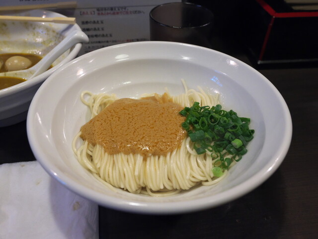 前と変わりませんね。つけ汁はトマトも相まって赤っぽいです。エビみそはオマールエビでしょう。麺はツルツルでコシのある平打ち多加水麺(?)。昆布水に漬かっています。