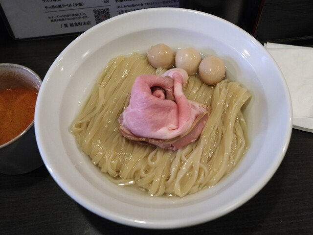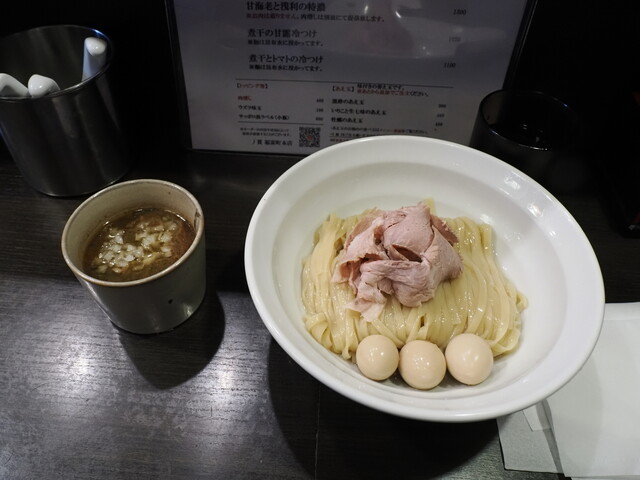 お味は、煮干しの味がいいですね。トマトのほんのりとした酸味も。冷やつけシリーズどれもおいしいですね。麺はつるっとした平打ち麺。いつもの低温調理肉ものっています。
