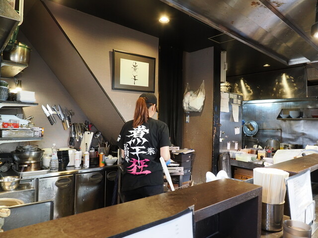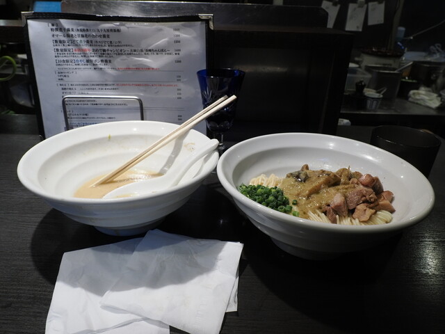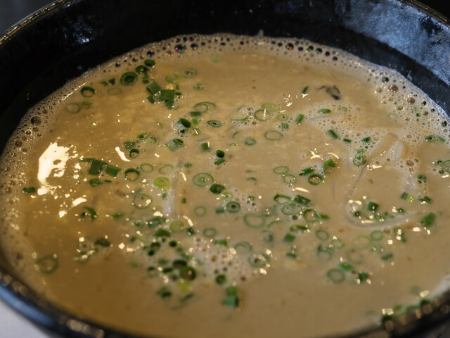 店炊き豚骨スープにイカ煮干しとマー油を合わせました。