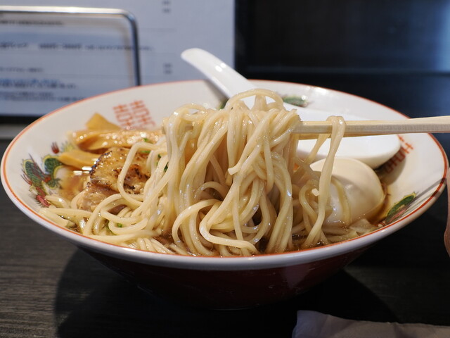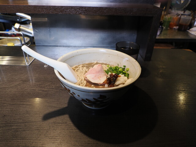 スープがこげ茶色。イカ煮干しとマー油ですね。通常の低温調理肉ものっています。お味はイカ煮干しとマー油の味(あたりまえだ)。豚骨スープに裏打ちされています。いつもハイクォリティの豚骨スープですが、店炊きというのに驚きます。とてもおいしいです。