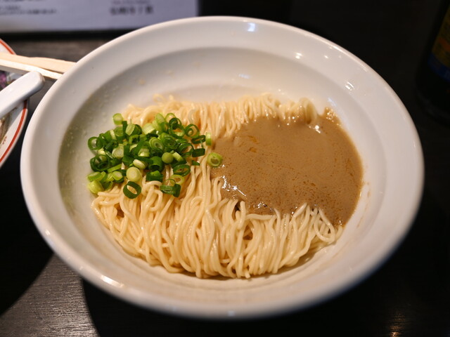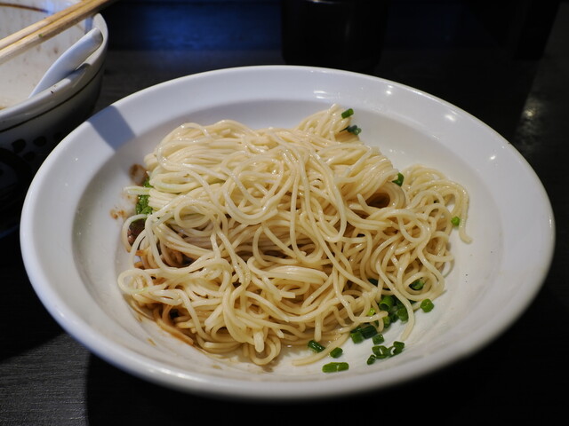 まず、麺を食べます。よく見ると麺の下にタレがあります。それを付けて食べると、おいしいです。なんというか何かの出汁のような。このまま、つけ汁なしで麺だけで食べられそうです。麺は、つるっとしていて、もちっとした感じもあっておいしいですね。