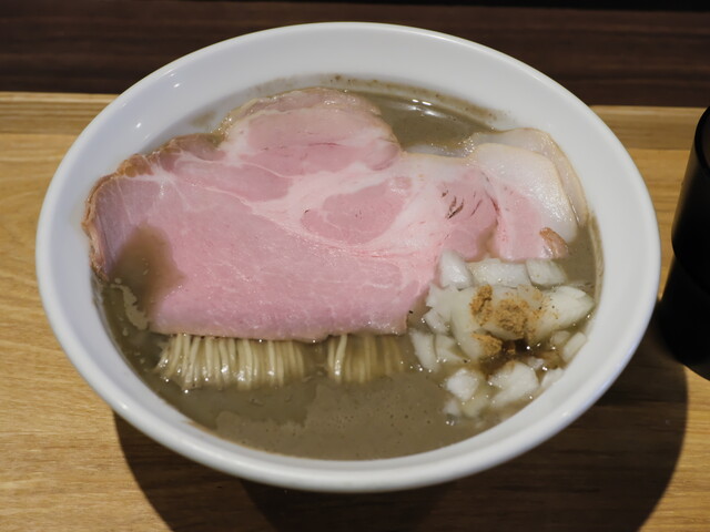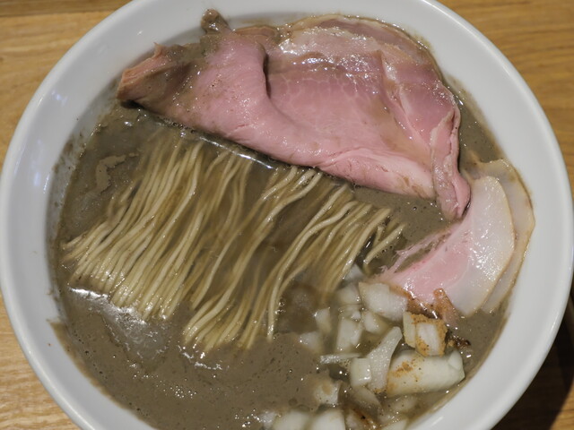 具の下の麺は見えません。タレはセメント色っぽい茶色。濃厚そうです。