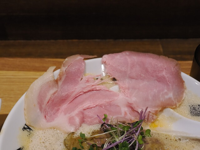載っているのは、低温調理チャーシュー2枚と刻みタマネギ。刻みタマネギに何やらカレー色の粉がちょびっとかかっています。