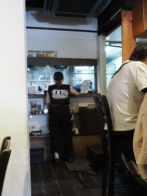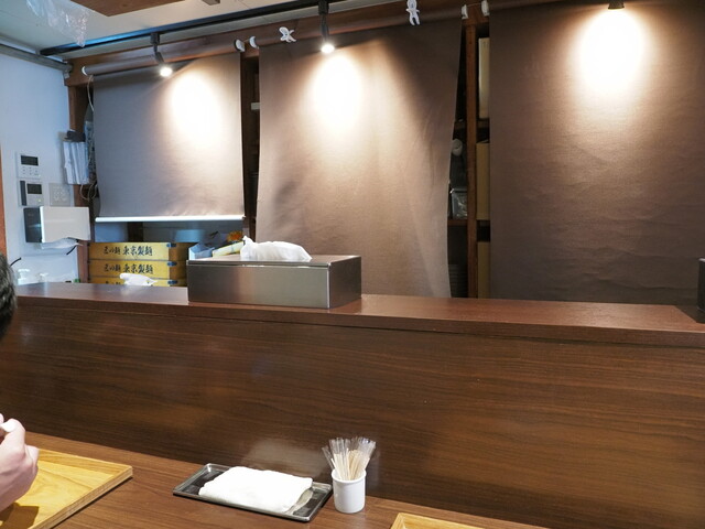 さて、この日は、食券買ってからいったん外に出る必要はなく、すぐに席に座れました。壁席じゃなく、カウンター席の手前から2番目です。ワタクシ壁席だったのは1回だけで、運がいいです。