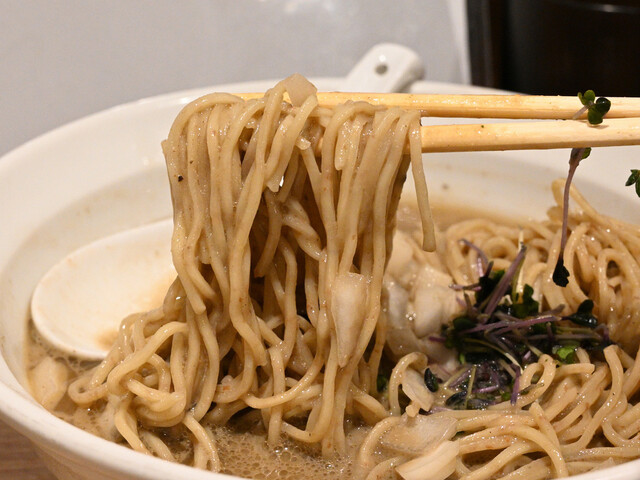 さざえといりこの焦がし醬油蕎麦、麺リフト