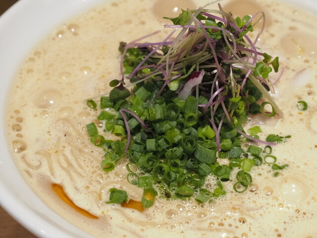 具は、煮込んだ豚肉と、黒ばら海苔、茶色い揚げ玉、材木メンマ、粗く刻んだ玉ねぎ、真ん中に白ネギと青ねぎ(白ネギの青いところ?)の小口切り。