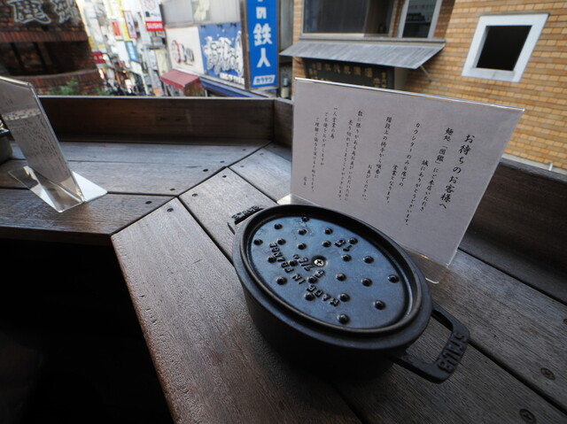 並んでいてもなかなか列は進みません。平均5分に1人くらいのペースでお客さんが出てくるところを見ると、これが1杯の平均作成時間でしょう。おそらくワンオペですね。列が進んで階段を上がったところにある札に書いてありまして。やっぱり一人営業、カウンターのみ6席とのこと。並んでいても途中で売り切れてしまうことがある、というのにはちょとビビりました。同じくワンオペの某店では店主が並びを見に出てきてましたが。