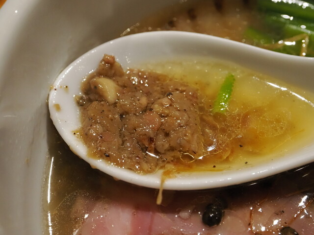 透明感ある薄茶のスープに鶏油が軽く層を成しています。