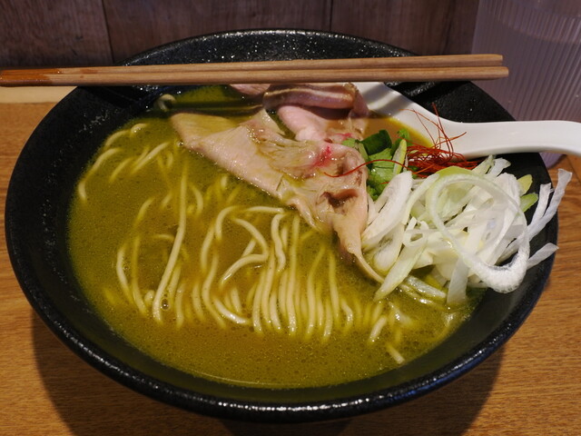 何やら少し緑がかった茶色いスープ。濃厚そう。麺は、ストレート細麺。いつもの薄くて大きい低温調理肉2枚。わきに白ネギ楕円切りと刻んだミツバと糸唐辛子。