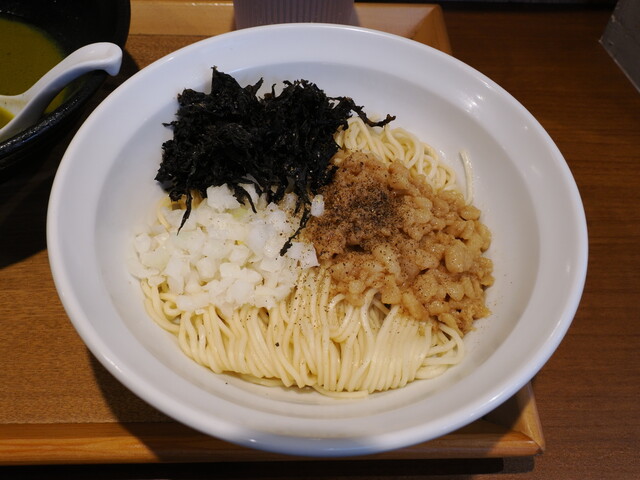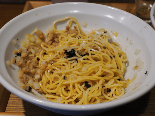 麺は同じくストレート細麺。茶色の大きめの粒状の背脂、バラ海苔、刻みタマネギです。麺の下には油ダレ。アソビル店で食べたのとおおむね同じです。麺量が丿貫の和え玉より多い気がしますが、気のせい?