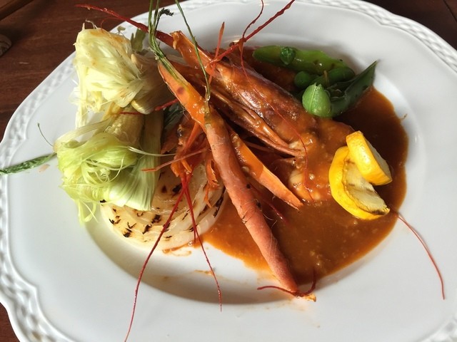 野菜畑をひっくり返したような付け合わせ楽しめる赤海老のアメリケーヌソースの一品はソースの手間がかかっているだろうという優れもので感心しました。付け合せの野菜は、ズッキーニ、スナップエンドウ、ミニコーン、ミニキャロット、新たまねぎなど。
