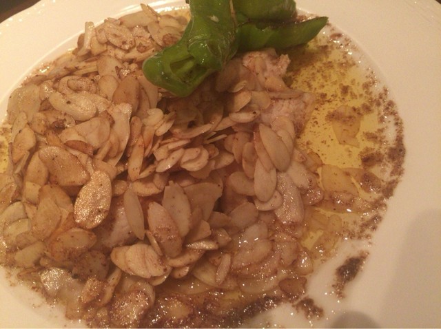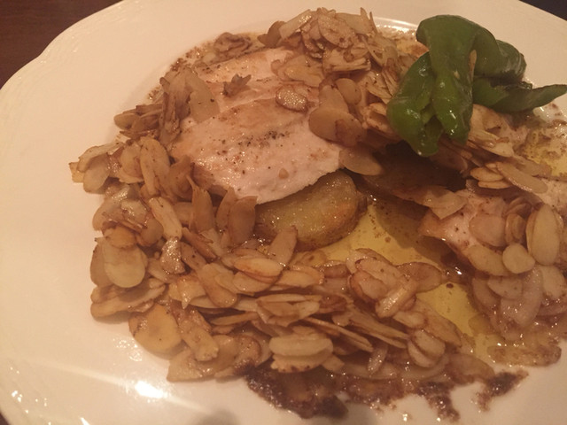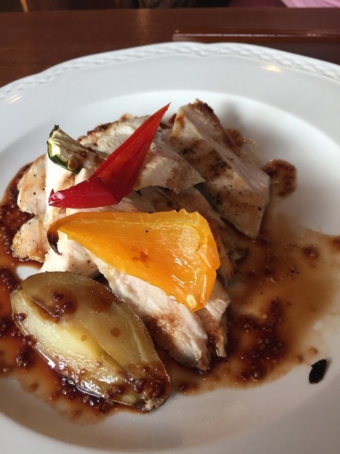 ▪️メインはスライスアーモンドがたっぷり乗っていて何が出てきたのかとワクワクする驚きのお料理が‼️ 何とアーモンドの下にはチキンのローストされたものと付け合わせの輪切りポテトが隠れていました。(^^)チキンは紀州地鶏だそうです。柔らかくて美味しいです。地鶏の旨味をまとったポテトが抜群の美味しさです。