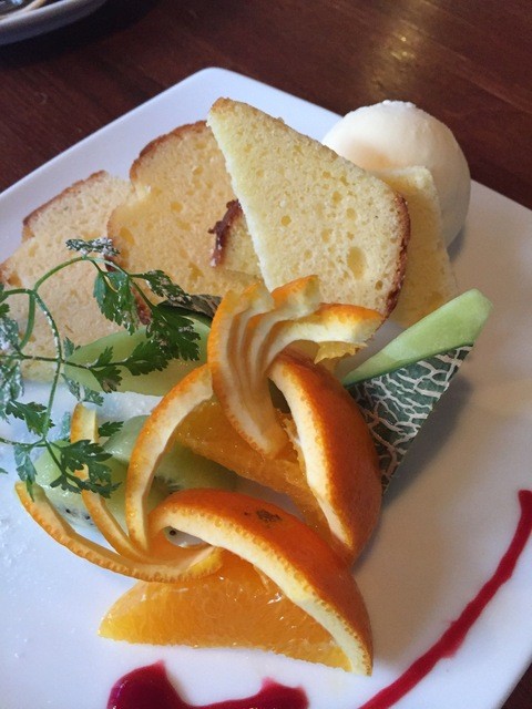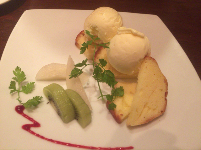 ▪️デザートは自家製パウンドケーキにバニラアイスを添えて出されました。梨とキーウイがお口直しに合っていました。